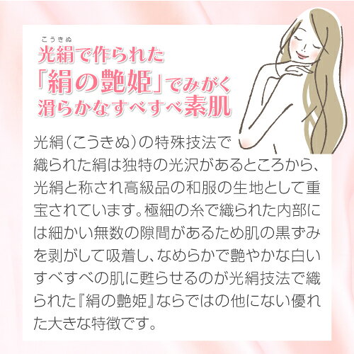 その光絹(こうきぬ)で作られた『絹の艶姫』で全身をみがいて、黒ずみやザラつきのない、なめらかで白くすべすべの艶やかなお肌を手に入れてください。