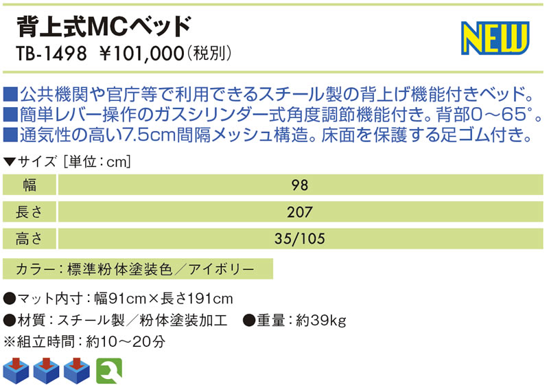 TB-1498 背上式MCベッド 公共機関や官庁等で利用できるスチール製の背上げ機能付きベッド。