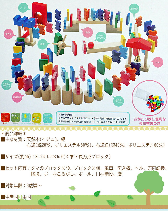 STマーク・・・日本玩具協会が定める安全基準 CEマーク・・・ヨーロッパにおける法的規制に対する適合性 ヨーロッパ安全基準に合格した塗料・染料を使用 その他 くまさん、いくつたおれるかな? 80ピースのブロックに付属のパーツも盛りだくさんで、ドミノの世界を広げると同時に、集中力も身に付きます。
