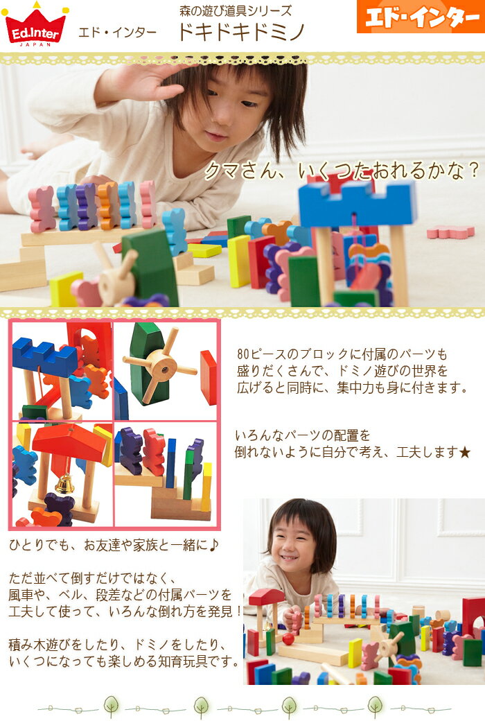 この商品にのしご希望のお客様はコチラをご覧下さい>> ギフト対応について■ エドインター / 森の遊び道具シリーズ ドキドキドミノ 商品詳細 商品名 森の遊び道具シリーズ ドキドキドミノ 主な材質 天然木、銅 他 サイズ(約) くま・長方形ブロック:3.5×1.0×5.0cm 対象年齢 3歳位〜 セット内容 くまのブロック×40、長方形ブロック×40、風車、突き棒、ベル、方向転換、階段、ボールころがし、ボール、円柱階段、袋 生産国 中国 エド・インター 幼児教室の設立をきっかけに誕生した玩具メーカー。