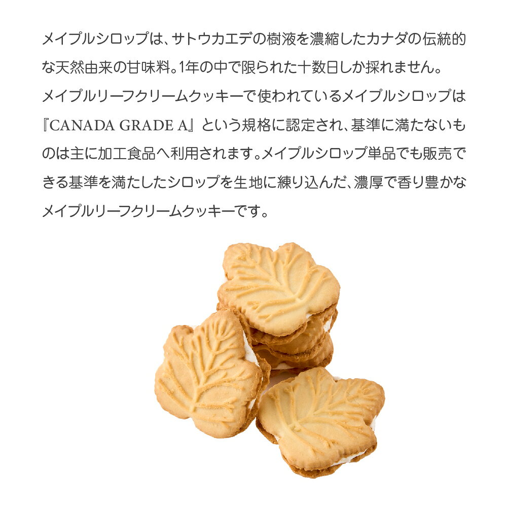 品名 メイプルリーフクリームクッキー 原材料 小麦粉、砂糖、ショートニング、異性化液糖、コーンスターチ、塩、メイプルシロップ、膨張剤、香料、乳化剤(大豆由来) この商品の工場では、ピーナッツ、乳、卵を含む商品を製造しています。