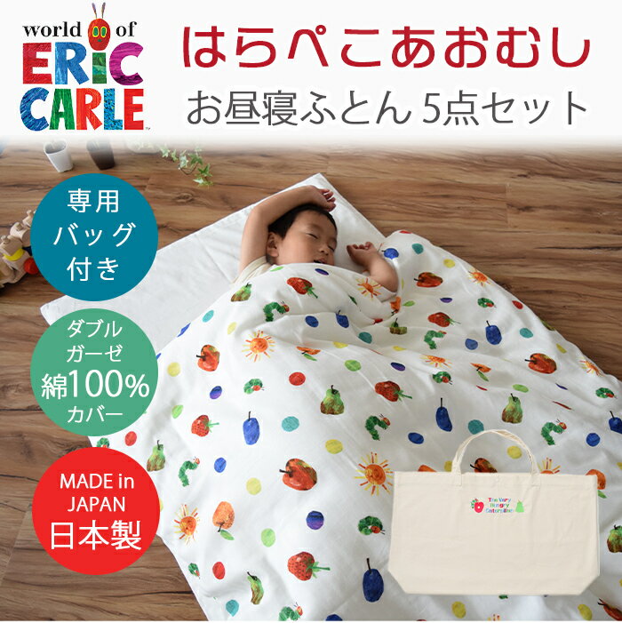 はらぺこあおむしがとっても鮮やかなカラーでプリントされたお昼寝ふとん 5点セット。