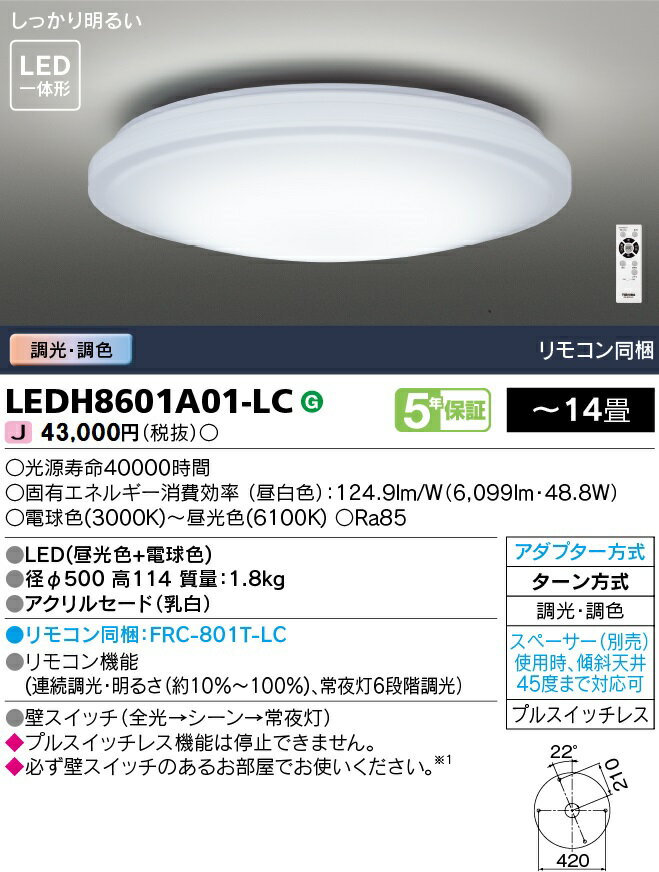 アダプター方式 ターン方式 調光・調色 プルスイッチレス スペーサー(別売)使用時、傾斜天井45度まで対応可 光源寿命40000時間 リモコン同梱:FRC-801T-LC 色温度 電球色(3000K)〜昼光色(6100K) 平均演色評価数(Ra)85 調光・調色 リモコン同梱TOSHIBA/東芝ライテックLEDシーリングライトLEDH8601A01−LC